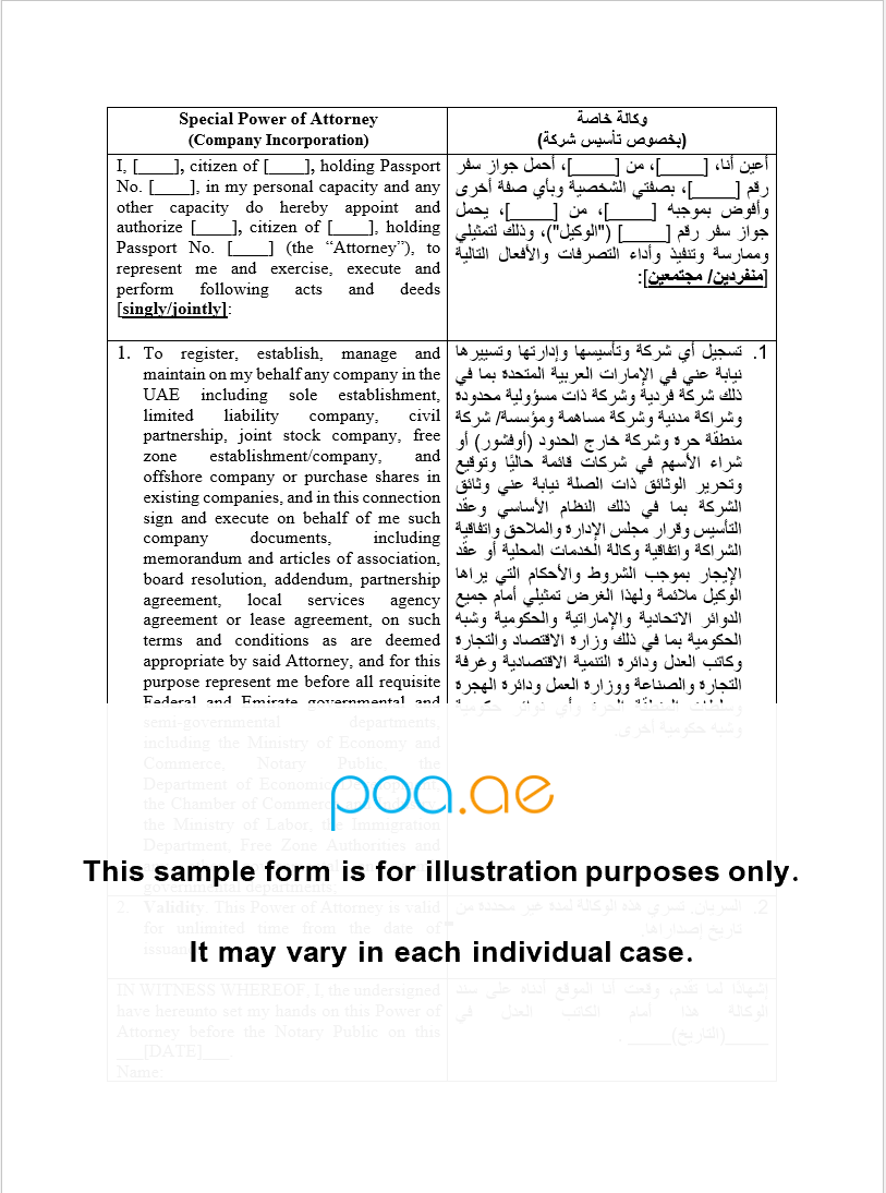 A Power of Attorney for Company Incorporation allows you to appoint one or more agents to establish a company or enter into a partnership for and on behalf of you. You can authorize an agent to sign company formation documents such as Memorandum and Articles of Association, lease agreement, partnership agreement, local service agent agreement and other legal documents and application forms to register a company and obtain a license on behalf of you.